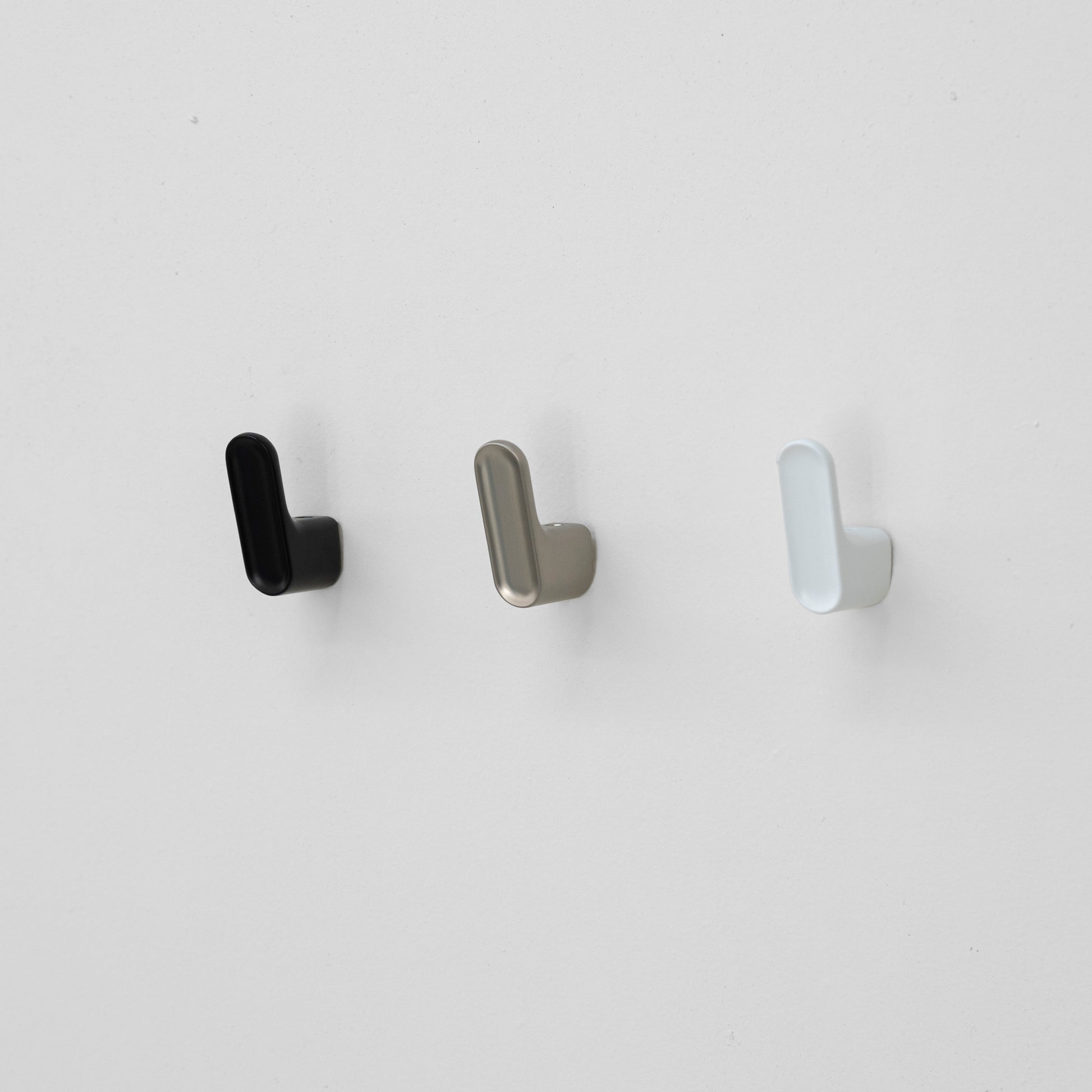 The Bobby Hook is a top-quality component of the Bobby Handle collection, crafted from durable zamak. Boasting the same sleek silhouette as the Bobby Knob, this hook features a 10mm deeper protrusion to provide enhanced functionality and practicality. It is available in elegant brushed nickel, matte white, and matte black finishes, ensuring a perfect match to the Bobby collection.