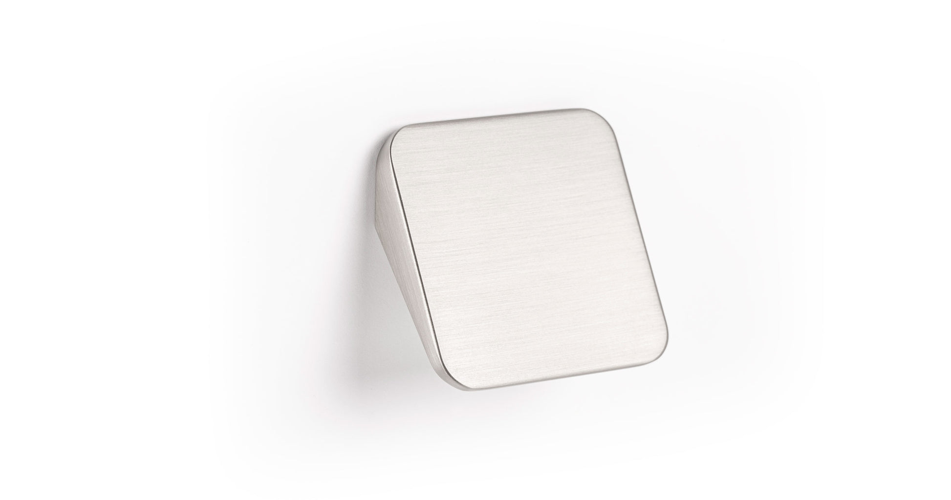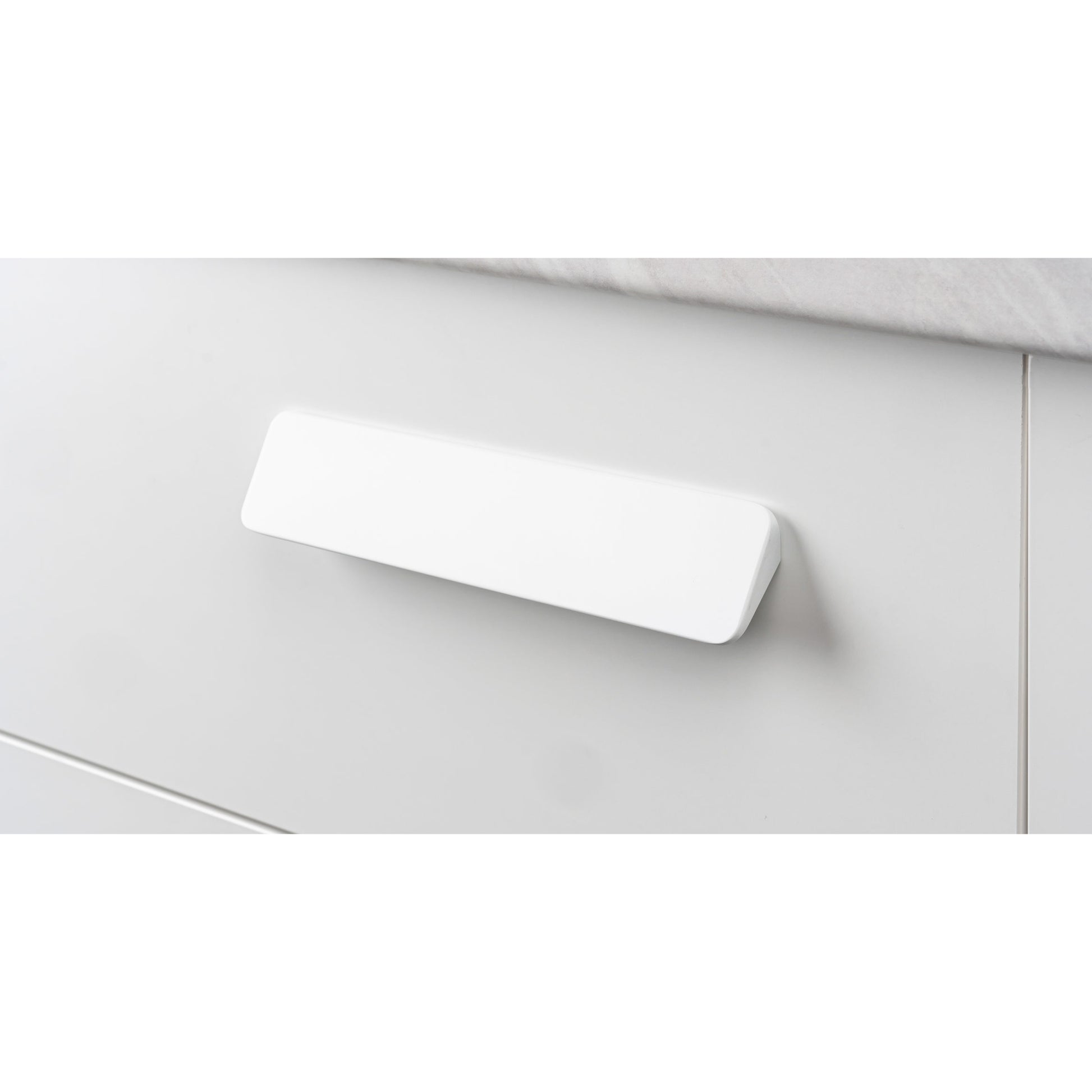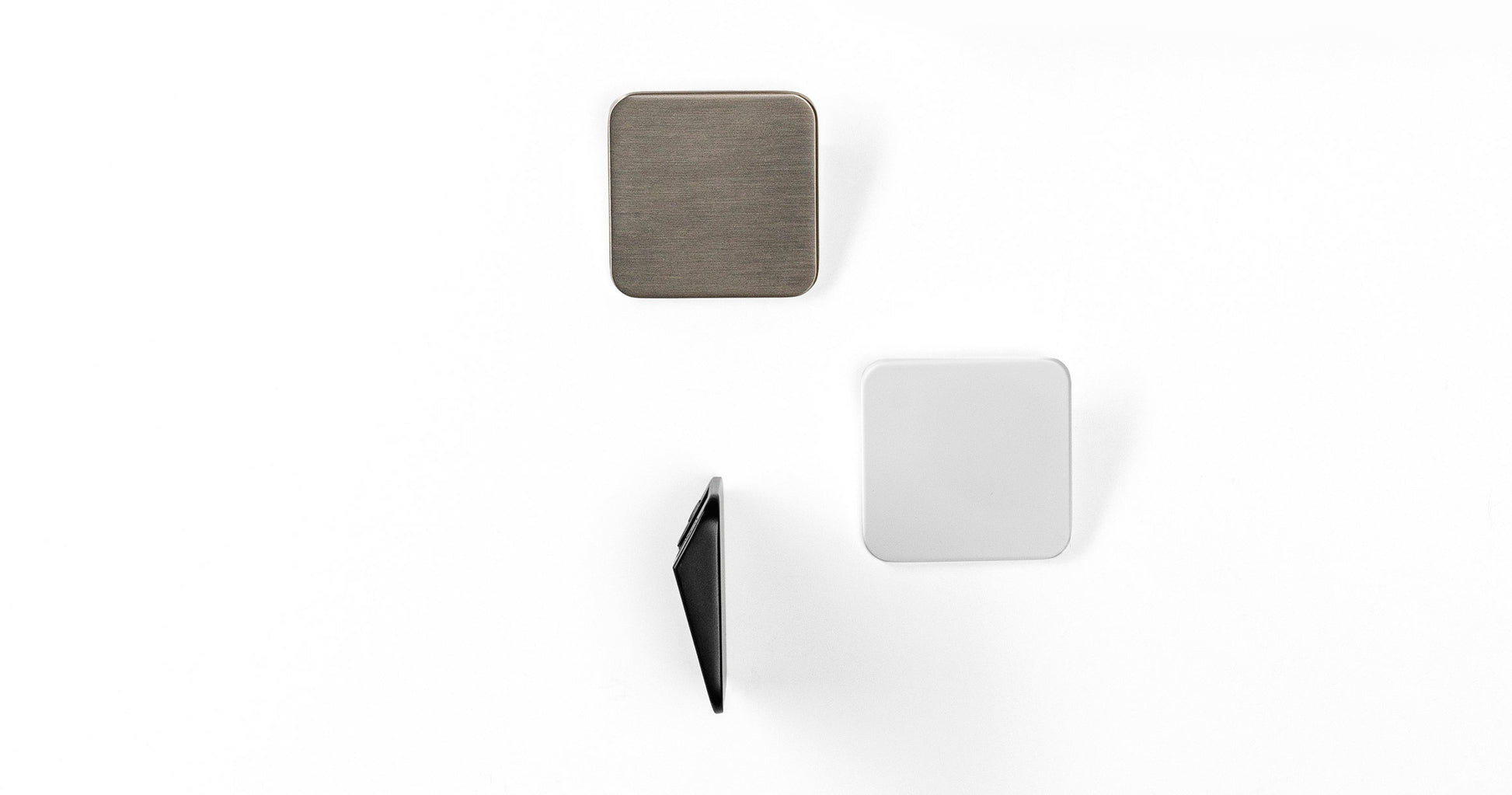 Shift has a triangular profile and a smooth, flat surface. The Shift handle and knob duo are available in three finishes; brushed nickel, matte white and matte black.